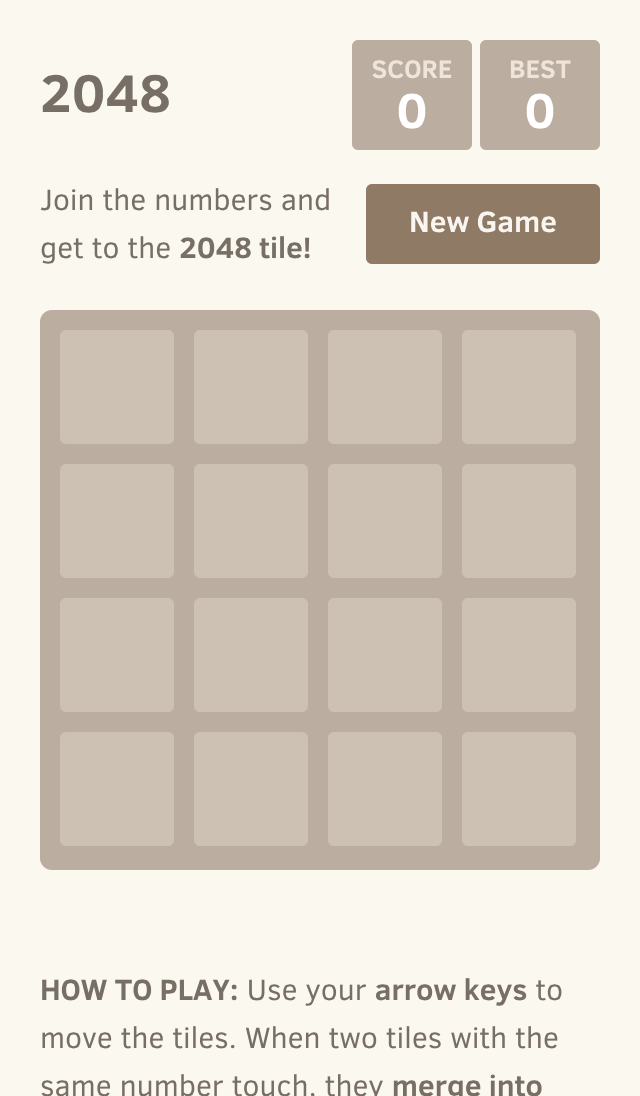 New GameHow to play: Use your arrow keys to move the tiles. When two tiles with the same number touch, they merge into one!